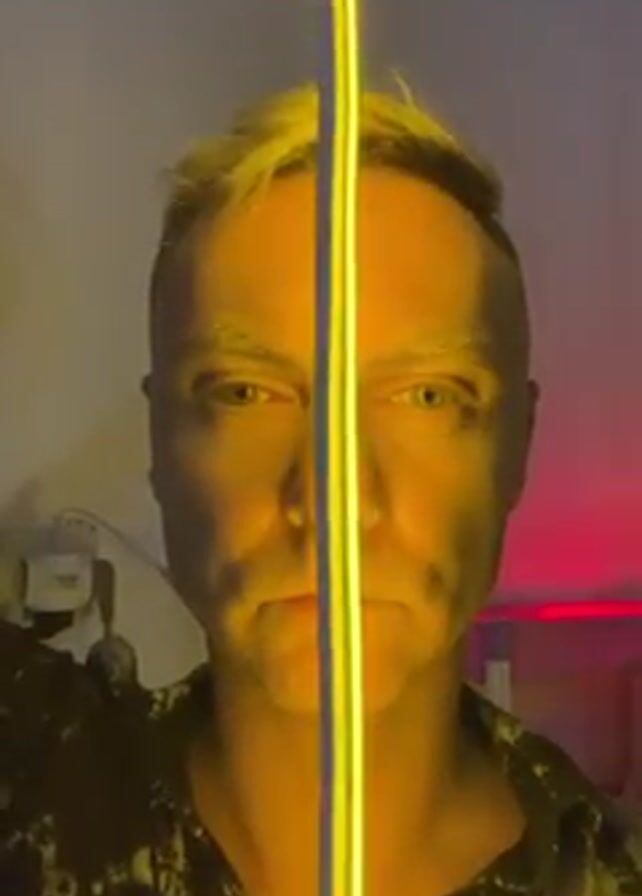 man facing the camera with a lit yellow tube held vertically in front of him, splitting his face in half. The man has short, light hair, and is wearing a patterned shirt. The lighting in the room appears to be a mix of yellow and red. There is also a white electrical outlet visible in the background. The man remains still throughout the short clip.