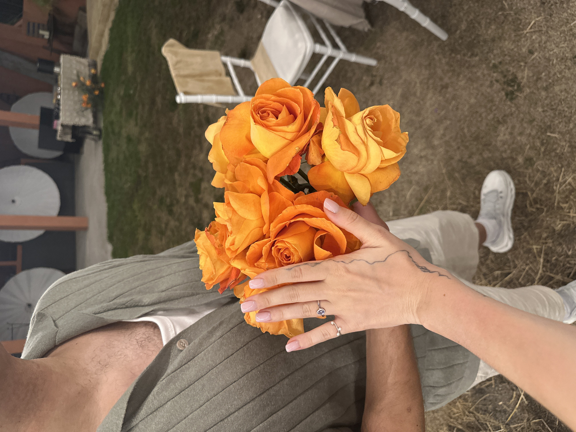 An outdoor scene in Si Sunthon, Thailand, captured from a slightly elevated perspective looking down. The central focus is on two individuals interacting with a bouquet of orange roses. One individual, largely obscured, is seen from the upper chest down, wearing a green ribbed collared shirt over a white undershirt, light-colored shorts, and grey sneakers. Visible chest hair is present. This individual holds a dense bouquet of approximately 7-10 vibrant orange roses in their left hand. The second individual's right hand, featuring light pink manicured fingernails, two rings (one with a pear-shaped purple stone, another with small white pearl-like accents), and a thin black linear tattoo on the inner wrist, is gently placed on or reaching towards the roses held by the first individual. The ground consists of dry earth, sparse green grass, and scattered straw. In the mid-ground, two white-painted bamboo-style chairs are visible, one with a light brown fabric draped over its backrest. The background features an orange-colored building or wall with two large white circular decorative elements. A table draped with a light-colored cloth and displaying small orange floral arrangements is also present in the background.