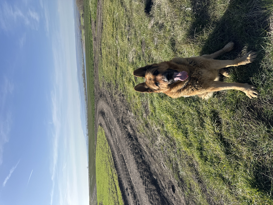 - "A German Shepherd dog, predominantly tan and black, is depicted seated on green grass in the foreground" by FM-XMi8X2, licensed under CC BY 4.0