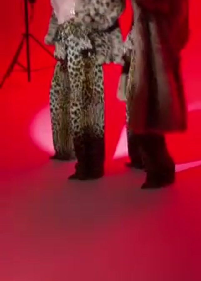 Two people are dancing in a red room. They are wearing leopard print pants and jackets. One has on a black bra top and has blonde curly hair. There is a camera light stand in the background. The music is loud.
