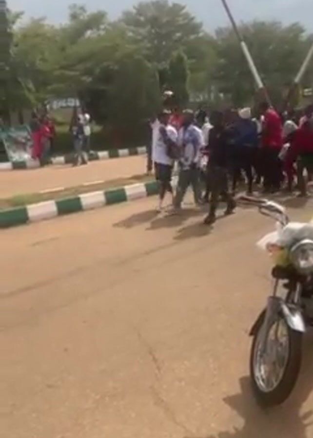 group of people standing near a closed gate. Most people are standing and pointing, while some are walking. They appear to be outside, based on the trees and green spaces visible in the background. A parked motorcycle is in the foreground. The sky is overcast.