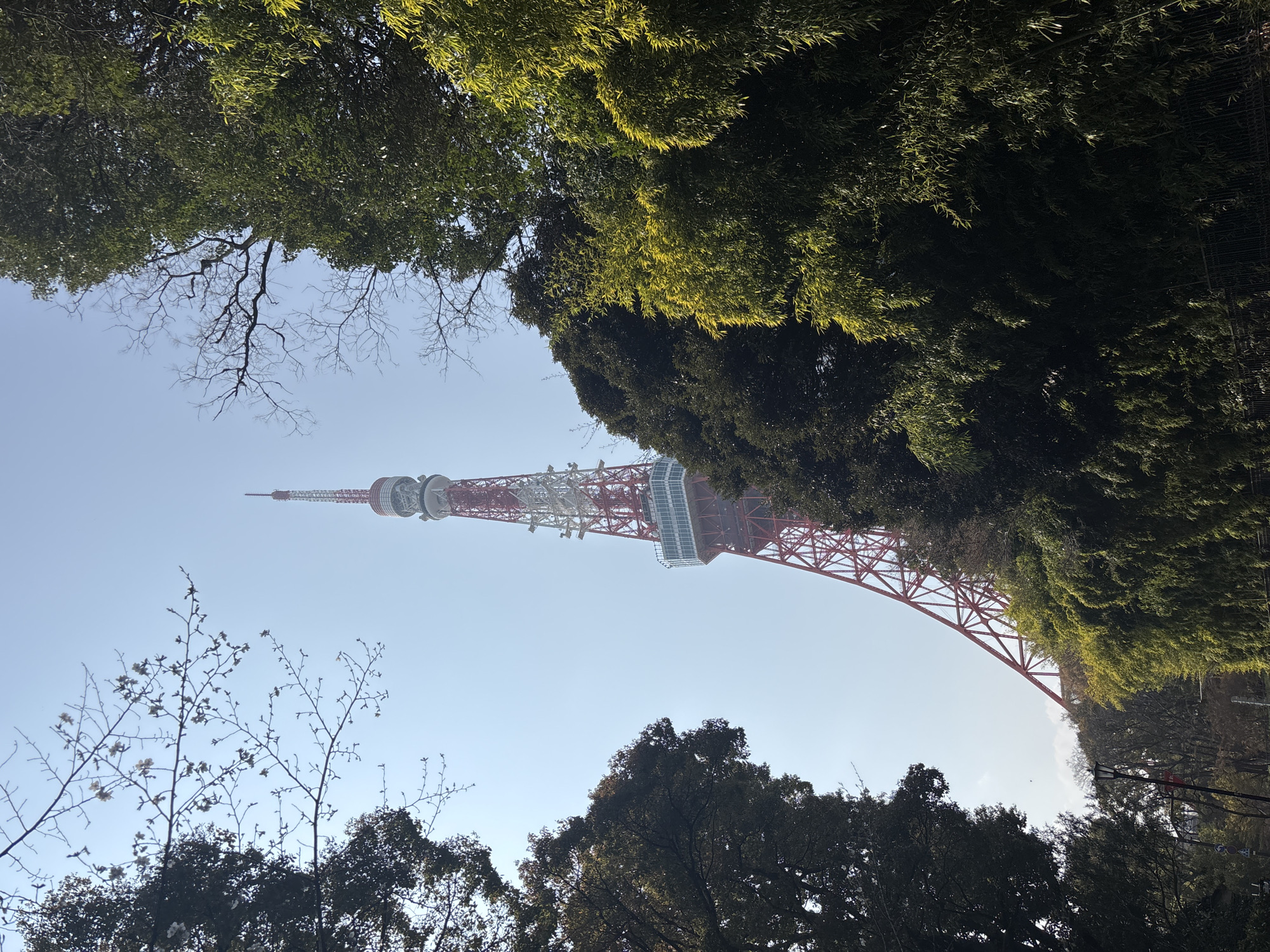 Tokyo Tower in Minato, Japan, viewed from a low angle, framed by trees and foliage at the top and bottom of the image