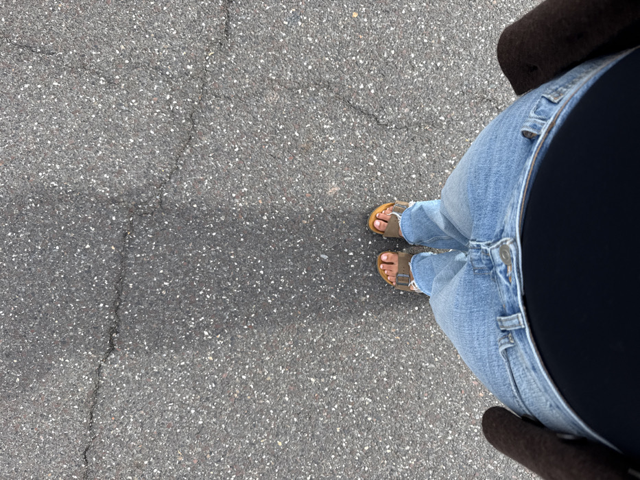 An overhead view depicts one individual standing on a dark gray asphalt surface. The person is visible from the upper thighs down, wearing light blue denim jeans with minor fraying at the cuffs and a dark, possibly black, shirt. On the individual's feet are open-toe sandals with dark olive green straps and tan soles, revealing bare feet with reddish-orange painted toenails. A dark brown object, possibly a sleeve or bag, is partially visible on the far left. The asphalt ground exhibits a textured appearance with embedded lighter aggregates and multiple fine, irregular cracks. Two distinct shadows, cast by the person's legs and feet, are visible on the asphalt, extending from the lower center towards the upper center of the frame. The image does not contain visual data to confirm the specified location of West Windsor, United States.