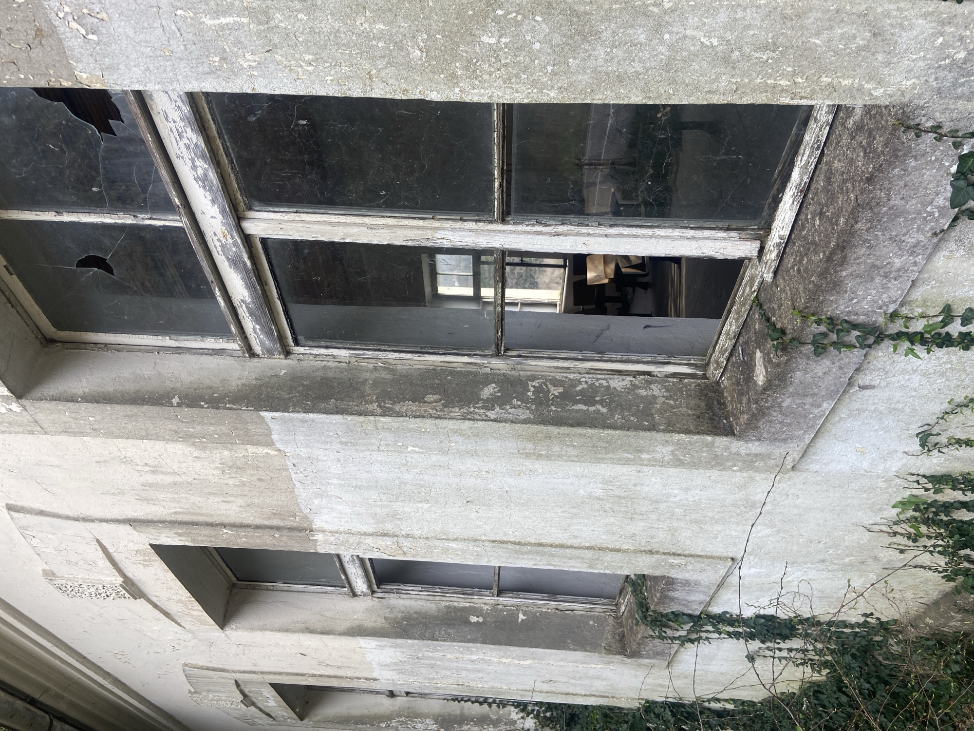 The image presents a segment of a deteriorating building exterior in Mišići, Montenegro. The facade, constructed of concrete or stucco, is off-white, exhibiting widespread peeling paint, discoloration, and weathering. Prominent vertical architectural elements punctuate the wall between window apertures. Four rectangular windows, equipped with multi-pane wooden frames, show their original white paint extensively flaked and degraded. The largest window on the right features two distinct, jagged fractures in its upper glass panes, along with extensive cracking and numerous cobwebs. Through this compromised window, the interior of a room is visible, furnished with multiple light-colored wooden chairs. A smaller, internal window is discernible deeper within this room, revealing a blurred exterior landscape of distant hills and vegetation. The lower portion of the building's exterior wall and the window sills are partially covered with climbing ivy vines and sparse, bare branches. No individuals or active interactions are present in the scene.