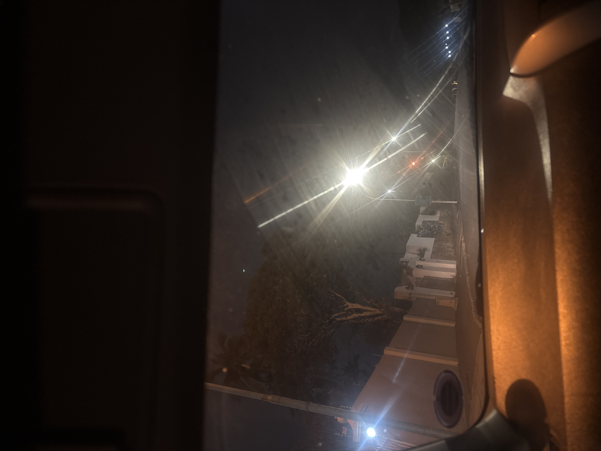 The image displays a nighttime street scene in Durban, South Africa, captured from the interior perspective of a vehicle. The upper segment of the frame shows the dark ceiling of the vehicle interior, while the lower segment reveals the dashboard and a portion of the right door panel, illuminated by a warm amber light. Through the windshield, a residential street is visible, curving gently uphill. On the left side of the street, a tall utility pole stands next to a high, light-colored perimeter wall, which features visible security fence posts along its top. Behind this wall, a large, mature tree with a distinctive pale trunk and branches is silhouetted against the dark sky. A prominent streetlight on the left emits a strong, starburst-like flare, providing significant illumination to the immediate foreground. Further along the ascending road to the right, additional streetlights are visible, also exhibiting starburst light patterns. Distant vehicle lights, identifiable as both red taillights and white headlights, are discernible along the road. The road surface is dark asphalt. No individuals or specific actions are present in the observable scene.