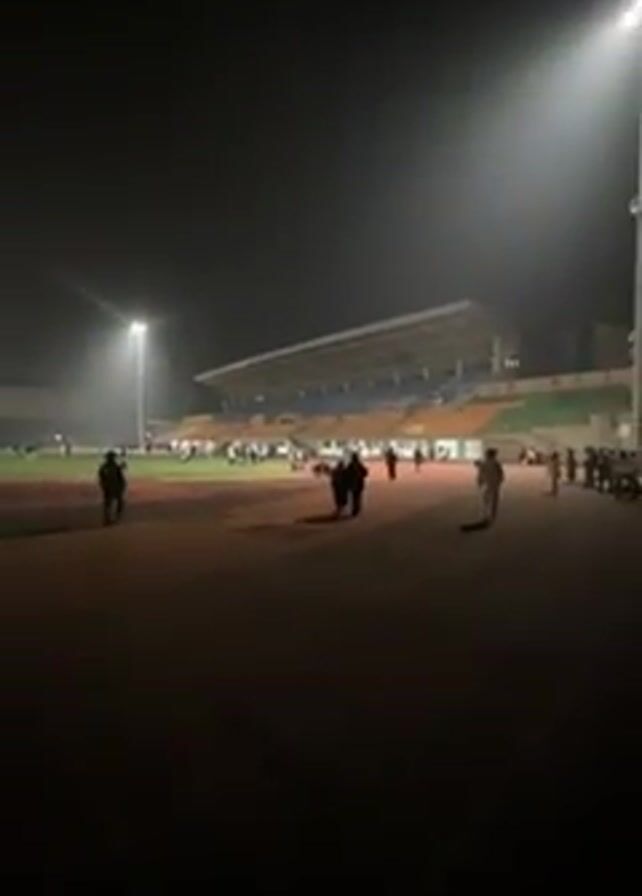 running track encircling a green field at a stadium. The stands behind the field are mostly blue with sections of green and yellow. Numerous people in white shirts are scattered on the field and track. A few people in darker clothing are walking on the track toward the right of the frame. The scene is lit by stadium lights, which create a somewhat hazy atmosphere.