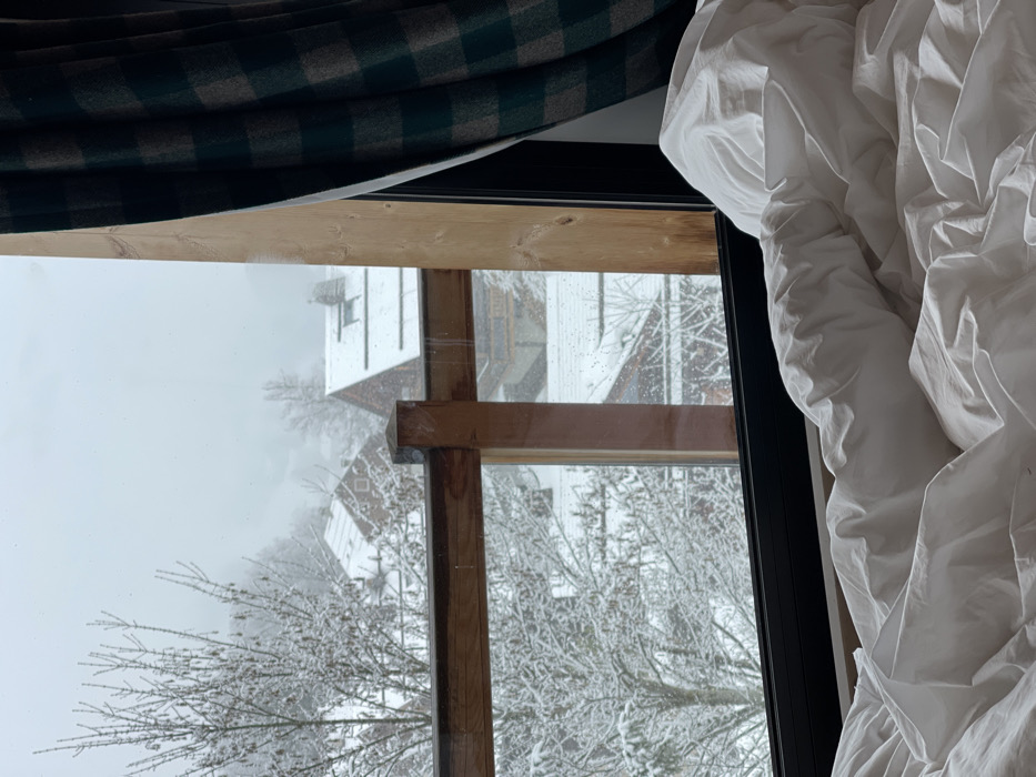 The image displays a winter scene observed from an interior room in La Clusaz, France