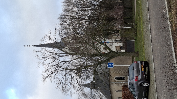 A church with a tall, pointed spire dominates the view, partially obscured by a bare tree. A gray car is parked along a paved area. A blue parking sign is visible near the car. The church's architecture suggests an older building with stone walls and arched windows. The sky is overcast. A strip of green space separates the paved area from a line of trees.