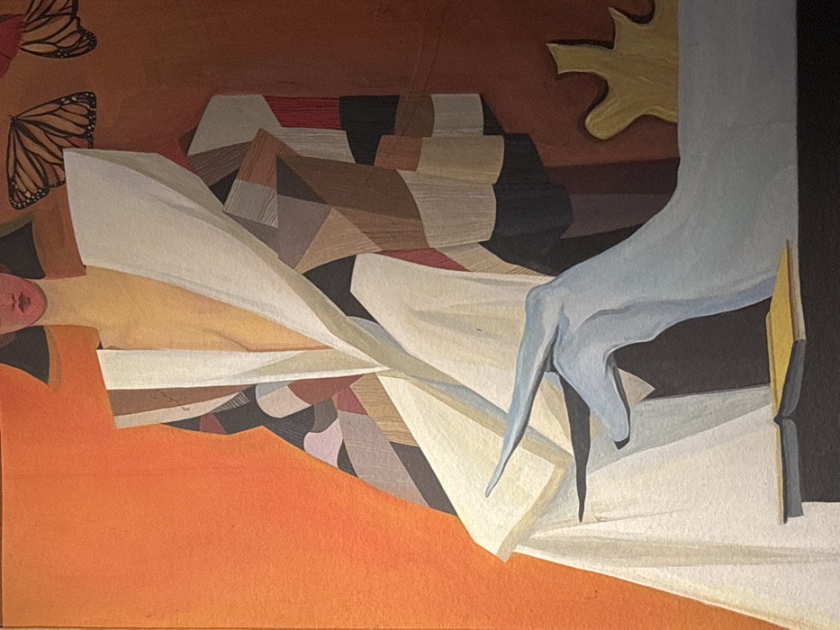 This geometric painting features a pale blue hand holding pages of a book. The color palette includes orange, brown, black, and gray tones. Butterflies are depicted in the upper left corner. The composition uses geometric shapes to define the objects and create a sense of depth.