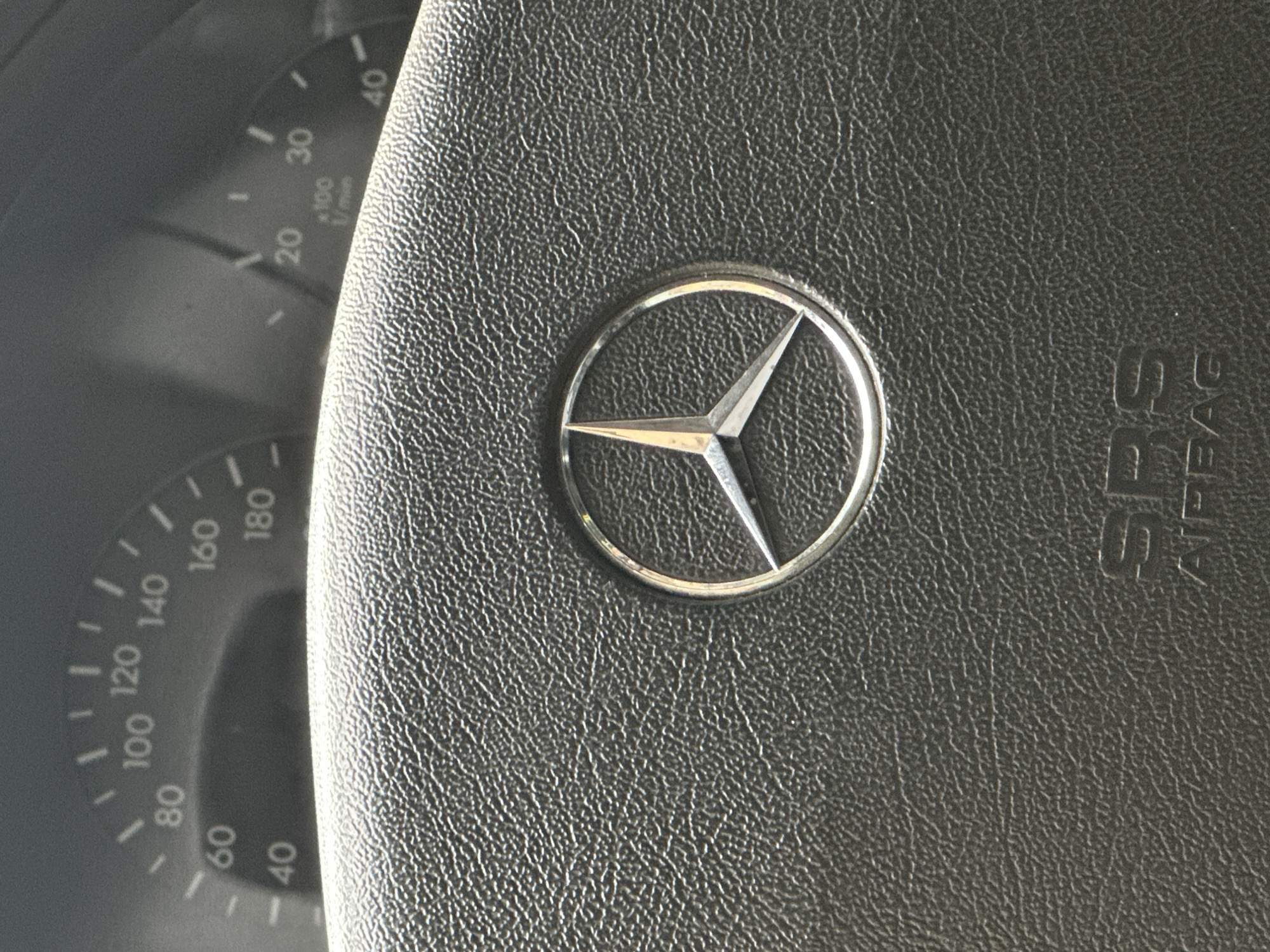 The image displays the interior of a vehicle, specifically a close-up view of a steering wheel and a portion of the instrument cluster. The steering wheel is dark grey or black with a textured surface. Centrally located on the steering wheel is a silver Mercedes-Benz three-pointed star logo, enclosed within a circular silver ring. Below this emblem, the text "SRS AIRBAG" is embossed into the steering wheel material. Above the steering wheel, the upper part of the vehicle's instrument panel is visible. On the left side of the panel, a speedometer dial is partially discernable, showing numerical increments for speed, including 40, 60, 80, 100, 120, 140, 160, and 180. On the right side, a tachometer dial is partially visible, marked with numbers such as 20, 30, and 40, accompanied by the inscription "x100 1/min." No individuals or external environment are visible. The scene is situated within a vehicle in the city of Asenovgrad, Bulgaria.