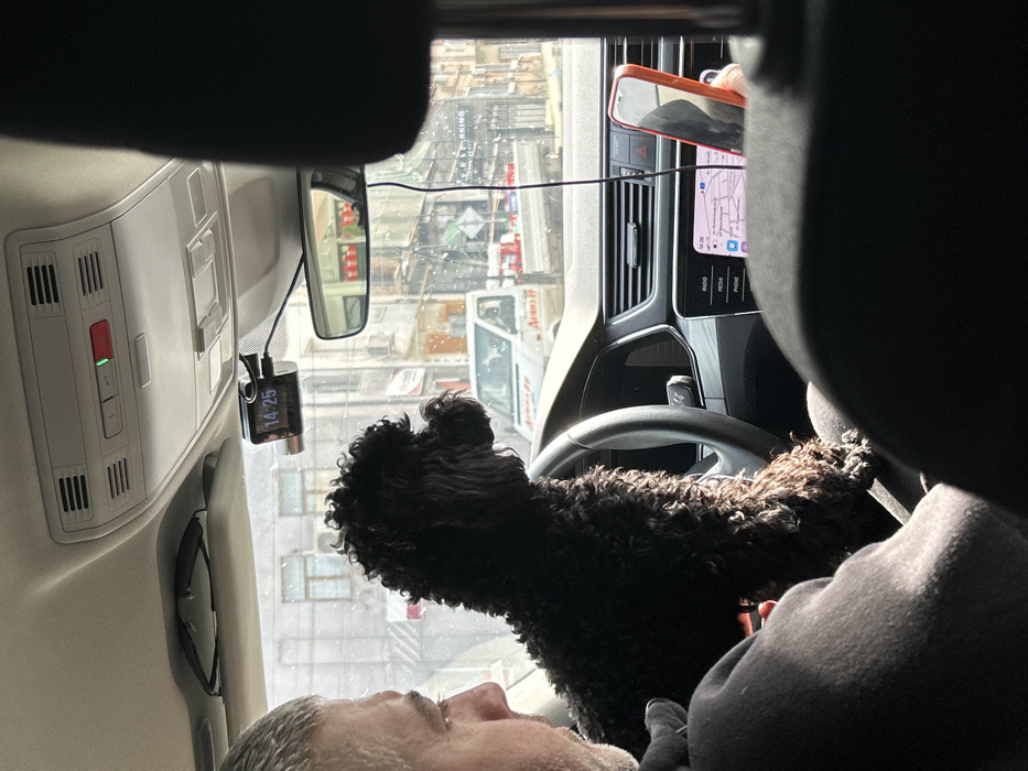 The image depicts the interior of a vehicle, observed from a rear passenger perspective, looking forward onto an urban street in Elhovo, Bulgaria. The time is 14:25, displayed on both a dashcam mounted below the rearview mirror and on a smartphone's navigation application. An adult male, with short grey hair visible in profile, occupies the driver's seat, wearing a dark long-sleeved garment. A small, black, curly-coated dog is positioned on his lap, facing forward and looking out the windshield. The driver's right hand holds a bright red-cased smartphone vertically on the center console, which displays a map or navigation application with Cyrillic street names. The vehicle's interior features a modern dashboard, an infotainment system, and an overhead console with illuminated buttons, one green. Through the windshield, a daylight street scene is visible. It includes multi-story buildings, a white delivery van with "АЛФА 77" and other Cyrillic text on its side, and a flatbed truck loaded with multiple red canisters. A partially visible sign displaying the word "PARKING" is also present. The scene is illuminated by natural light, indicating daytime conditions.
