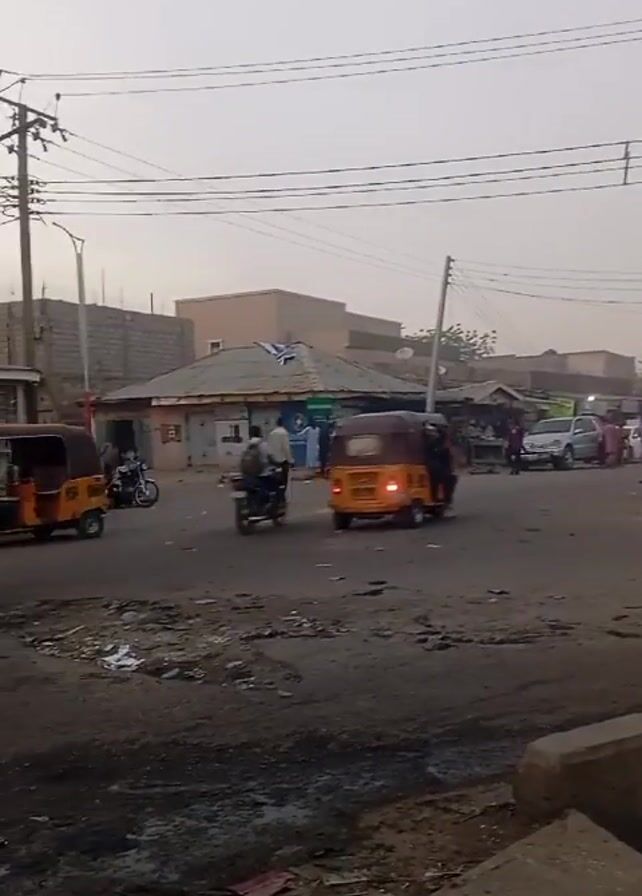 street intersection in an urban area. There are several yellow auto rickshaws (tuk-tuks) driving and parked on the road, along with motorbikes. Pedestrians are visible walking and standing near a building with shops. The road surface appears damaged and covered with dirt and debris. Overhead, there are power lines and utility poles. The sky is overcast, suggesting either early morning or late afternoon. The overall setting is a bustling, somewhat rundown urban environment.