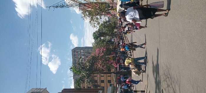 A busy street scene in the Nairobi Central Business District, likely Moi Avenue or a parallel thoroughfare, is depicted under a bright blue sky with scattered white clouds. The asphalt road is populated by numerous pedestrians and shows evidence of vehicular traffic in the distance. In the foreground-midground, a person wearing a yellow shirt and blue jeans pushes a heavily loaded handcart, covered with light-colored material, towards the left of the frame. To the right, a woman in a white t-shirt and dark skirt walks away from the camera, carrying a light-colored shopping bag in her left hand. Other pedestrians are visible, moving in various directions, some on the main road and others in a section separated by black and white striped bollards. Multi-story commercial buildings, including a tall grey structure with multiple windows on the left, line both sides of the street. Palm trees and trees with pink blossoms are interspersed along the urban landscape. Overhead electrical or communication wires crisscross the sky. Partial views of vehicles, consistent with matatus, are discernible in the background, indicating traffic.