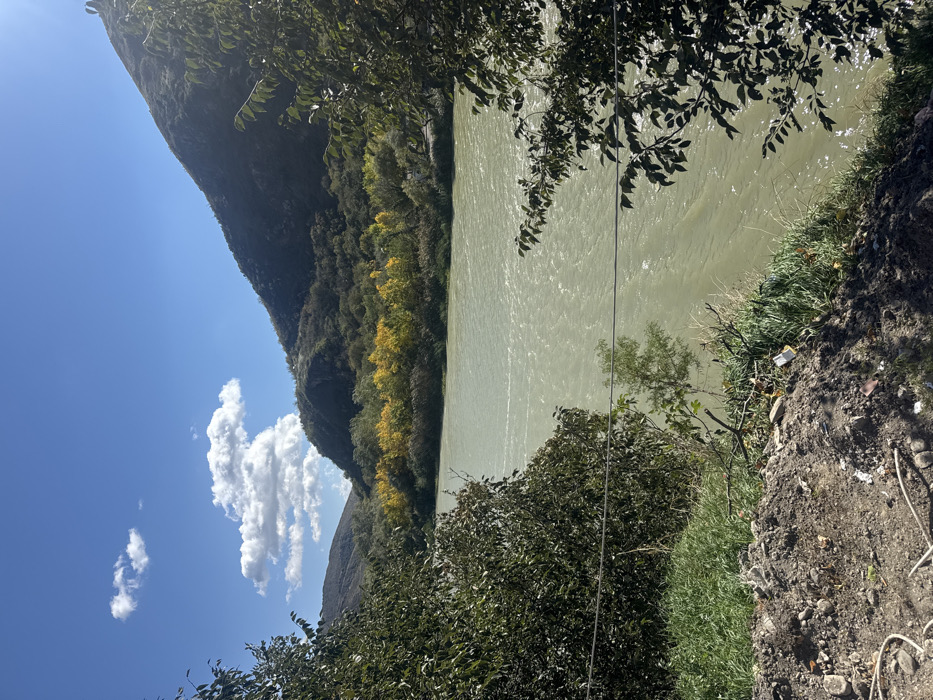 The image displays a riverine landscape in Mtskheta, Georgia, viewed from an elevated position. The scene is under a clear blue sky with scattered white cumulus clouds. A wide river, characterized by light green, turbid water with visible surface ripples, flows horizontally across the mid-ground. On the far bank of the river, a distinct line of trees exhibits vibrant yellow and orange autumn foliage, contrasting with the darker green, densely vegetated hills and mountains that rise beyond them into the background. The near bank, in the foreground, consists of a steep dirt embankment with patches of green grass. The immediate foreground shows disturbed earth, loose soil, small rocks, and indeterminate debris. Dark green, leafy trees and bushes frame the view on the left and right sides of the image. A thin, dark line, possibly a cable or wire, extends horizontally across the lower mid-ground, suspended above the embankment and the river. No individuals, animals, or prominent man-made structures are visible. The scene is brightly illuminated by natural sunlight.