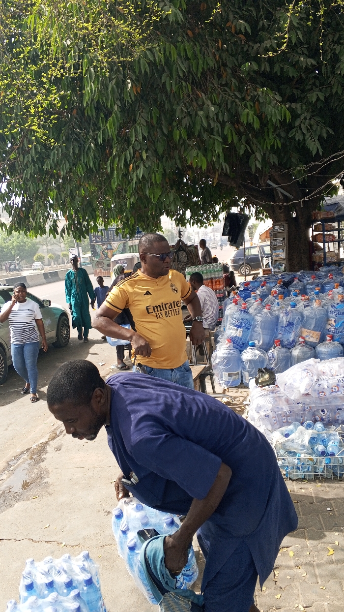 An outdoor scene in Kawaji, Nigeria, depicts a street-side water vending operation under a large, leafy tree providing shade