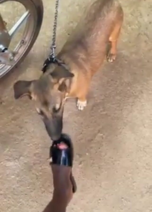 A person is holding a black sandal near a small, brown dog with a black muzzle on a chain leash. The dog sniffs the sandal and then puts its front paw on it. A motorcycle is parked nearby. The ground appears to be dirt.