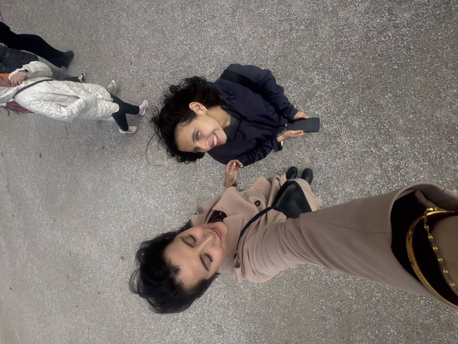 The image depicts a high-angle, downward-looking view of two adult females in a public paved area in Vienna, Austria. The female on the left, holding the camera, has dark hair, wears a beige trench coat, a black shoulder bag, and gold bracelets on her right wrist. Her right hand is gently placed on the left arm of the second female. She is looking down and to her right with a subtle smile. The second female, on the right, has dark, curly hair, wears a dark blue zippered jacket, and holds a black smartphone vertically in her left hand. She is looking upwards towards the camera with a broad smile. In the upper right background, several blurred pedestrians are visible, including one individual wearing a white quilted hooded coat, black pants, and pink sneakers. The ground is a light grey, speckled paved surface, with sparse small debris or leaves scattered across it. The scene is outdoors under diffused lighting.