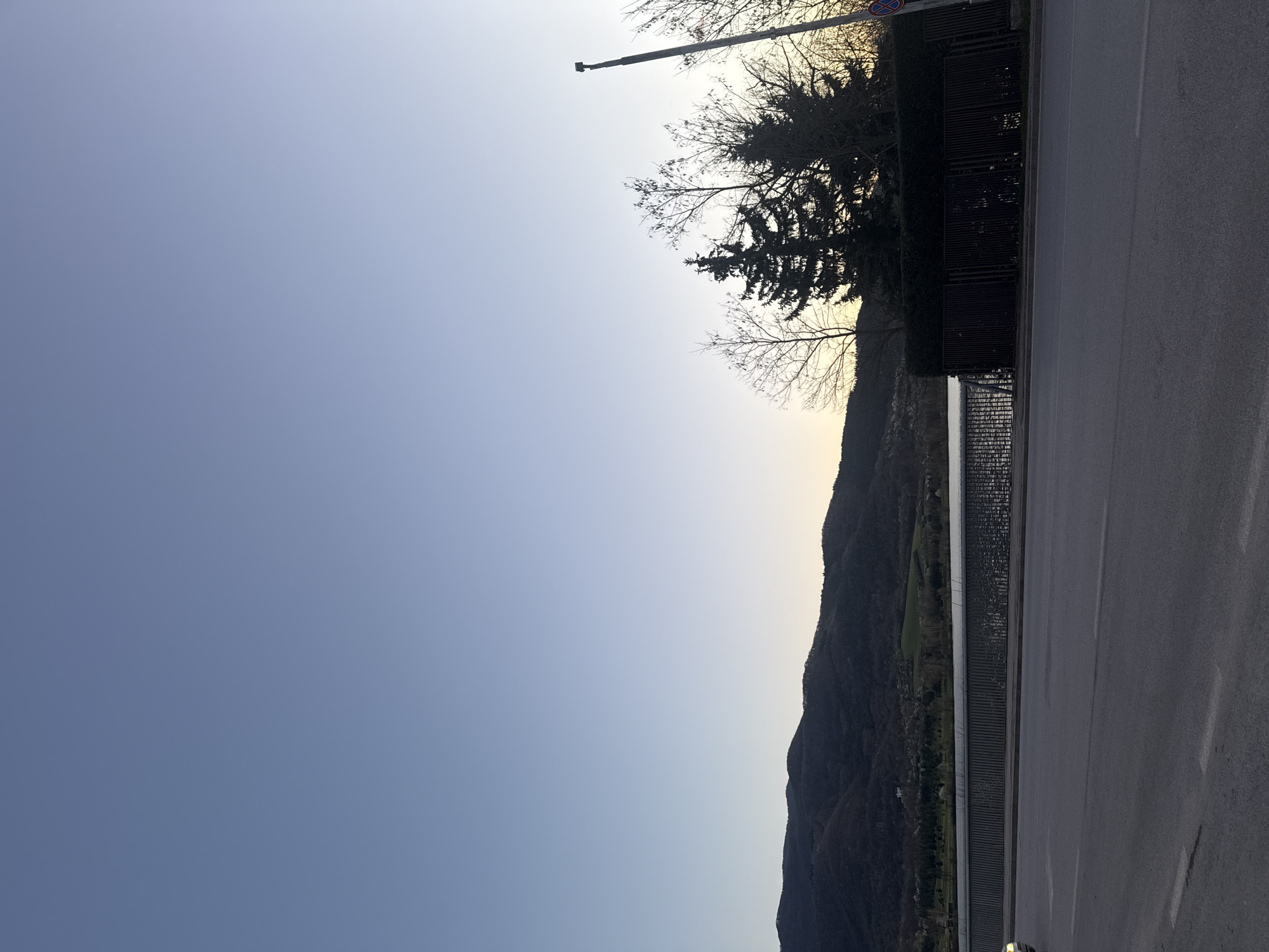 n outdoor scene with a clear sky occupying most of the frame. A road stretches along the right side of the image, marked with a solid white line. To the left of the road is a fence, likely a guardrail, situated above a lower area potentially leading to a body of water. A tree line and a mountainous backdrop are seen behind the fence. The photo appears to be taken in the vicinity of Pravets, Bulgaria, judging by the characteristic landscape and infrastructural elements. No people are visible. The light suggests either sunrise or sunset. A utility pole is visible towards the top of the image.