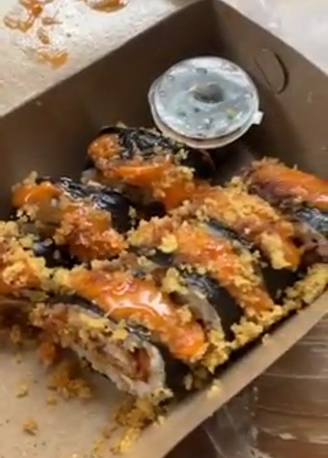 close-up of two food containers. The first is a cardboard box filled with sushi rolls topped with what appears to be orange sauce and crispy flakes. A small container of sauce rests on the side. The second container is a white paper bowl filled with a rice bowl dish, featuring pieces of cooked chicken, sliced red chili peppers, onions, scrambled eggs, and small pieces of carrots and lettuce. Chopsticks are seen picking up a piece of chicken from the bowl. The background is a plastic tablecloth with water droplets and spilled sauce.