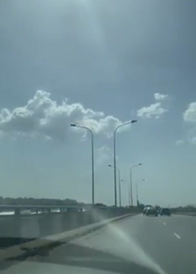 A vehicle travels down a freeway on a sunny day. The sky is light blue with scattered white clouds. Streetlights line the side of the road, and other vehicles can be seen in both directions. In the distance, a cell tower and a large building under construction are visible. The vehicle's windshield has some glare from the sun.