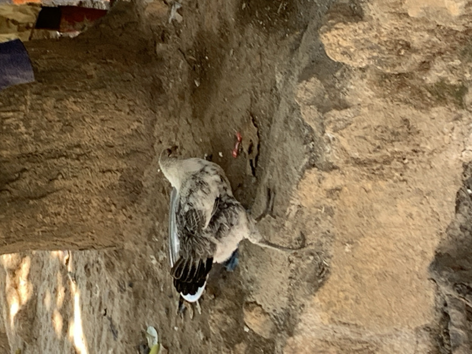 - "A mottled white, grey, and black chicken is observed in mid-stride, walking on uneven, dry, light brown dirt ground" by FM-ymYHD2, licensed under CC BY 4.0