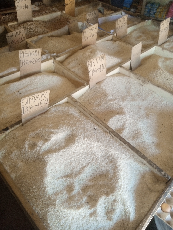 This image depicts an indoor market stall in Mtopanga ward, Kenya, showcasing multiple varieties of bulk grains