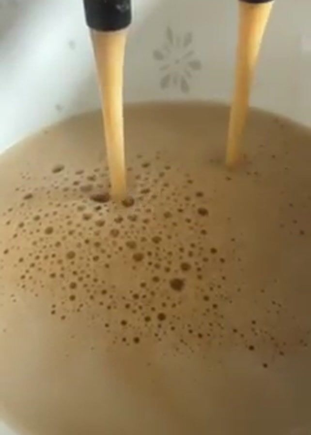 A close-up shot shows a dual-spout coffee maker dispensing a light-brown liquid into a white bowl. The liquid forms many tiny bubbles on the surface. The white bowl features a pale gray snowflake pattern.