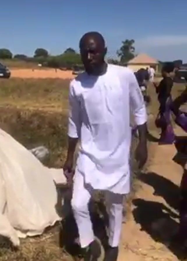 bride in a large, white gown standing in a field with a man in a suit, who is holding a water bottle. The bride has her hand on her stomach and appears to be laughing or talking. In the next shot, a group of women wearing purple and white patterned clothing are walking in the same field. There are other people in the background, as well as cars and buildings in the distance. The sky is blue and the weather appears to be sunny.