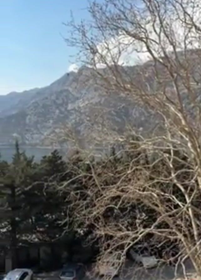scenic view from a high vantage point. Initially, a bare tree dominates the foreground, partially obscuring a view of mountains and a body of water in the background. Below, a parking lot with several cars, including a red one, is visible. As the camera pans right, the view opens up, revealing a wider expanse of the bay surrounded by mountains. Evergreen trees dot the landscape, and the blue sky is slightly hazy. The camera continues to pan, showcasing rooftops of buildings nestled among the trees.