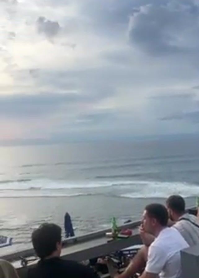 people relaxing at an outdoor rooftop bar or lounge overlooking the ocean. The setting appears to be at sunset with varying degrees of cloud cover. Some individuals are seated, drinking, and socializing. Several beer bottles are visible on the ledge. The camera pans across the scene, showing different groups of people, including a woman wearing sunglasses. The surrounding landscape includes a coastline and buildings on a hill.