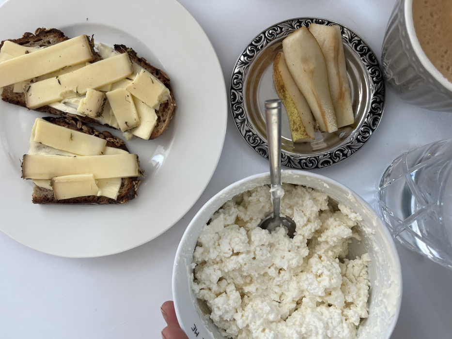 The scene depicts a tabletop meal observed from a top-down perspective, located in Gangloff, Germany. A light-skinned human hand is visible on the left, positioned near a white ceramic bowl filled with a granular white substance, identified as cottage cheese, with a silver spoon partially submerged within it. A large white circular plate contains two slices of dark, seeded bread, each topped with a pale spread and multiple rectangular slices of light yellow cheese, some exhibiting traces of herbs or rind. Adjacent to the cottage cheese bowl, a small, circular silver-colored plate with an embossed rim holds several peeled and sliced segments of a pear. A faceted clear glass, partially filled with clear liquid, and a light-colored cup containing a foamy brown beverage are also present on the white surface.