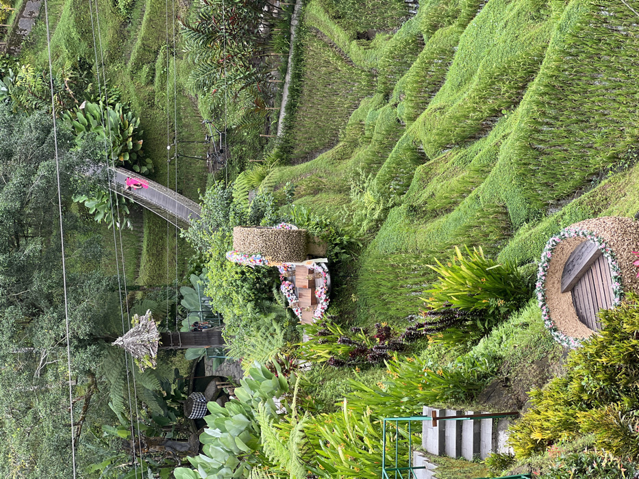The image depicts a verdant terraced landscape, identified as Tegal Suci, Indonesia. The scene is dominated by multiple levels of lush green rice paddies, partially submerged in water, which descend from the upper right towards the lower left. Steep slopes between the terraces are covered in dense tropical vegetation, including various ferns, broad-leaf plants, and flowering plants with red and yellow inflorescences. In the upper-mid section, a suspension bridge with metal cables and wooden slats ascends diagonally from the right towards the left. A single individual, dressed in bright pink clothing, is walking on this bridge, moving upwards. Further left and slightly lower than the bridge's apex, a small, traditional thatched-roof structure stands amidst thick foliage. Below this, a checkered black and white cloth is draped over an unidentifiable object or structure. In the mid-right, near the base of the bridge, two bicycles are parked on a narrow dirt path that winds through the terraces. Overhead, several thin utility lines traverse the upper portion of the frame. In the mid-ground, on a vegetated slope, a large, crescent-shaped decorative structure, constructed from woven light-colored material and adorned with pink, white, and purple flowers, overlooks the rice paddies. In the lower-left foreground, a gray stone staircase with green metal handrails descends into the scene. Below the staircase and to its right, a smaller, circular nest-like structure, also made of woven material and decorated with flowers, contains a wooden slatted bench. Several indistinct figures are visible in the distance near the traditional hut in the upper-left background.