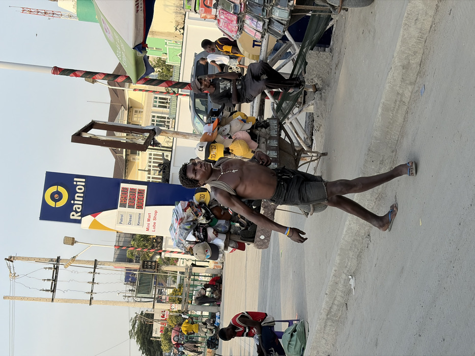 A shirtless man with dark hair and a cross necklace stands on a street. He is surrounded by items on a cart, including hats and other goods. Behind him, another man sits on the cart, and a gas station sign for "Rainoil" is visible, showing the prices for petrol, diesel, and kerosene. Power lines and buildings are in the background, and other people are seen along the roadside.