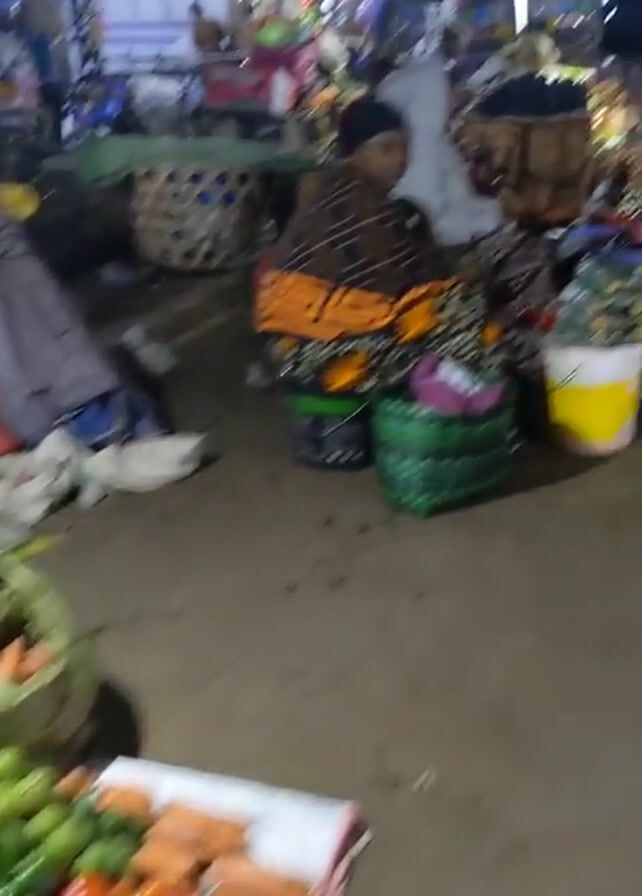 nighttime outdoor market scene with vendors selling various vegetables and fruits. The camera pans across several stalls displaying tomatoes, green peppers, carrots, green beans, and other produce. Some vendors are sitting by their wares, while customers walk through the market. The area appears to be lit by overhead lights. There's a general sense of activity and commerce within the market.