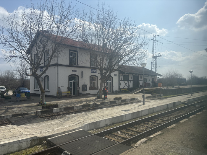 The image depicts the Byala train station in Byala, Bulgaria, captured from a perspective close to the tracks