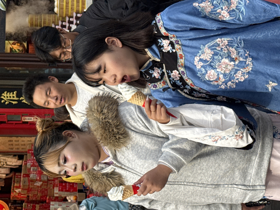 Four people, including three women and one man, are visible. Two of the women hold ice cream cones. The woman closest to the viewer wears a grey hoodie with a furry collar. The woman above her is dressed in a blue embroidered garment. The other woman wears a white top. The man behind her dons glasses and a black top. Boxes are visible in the background on the left. The setting appears to be outdoors.