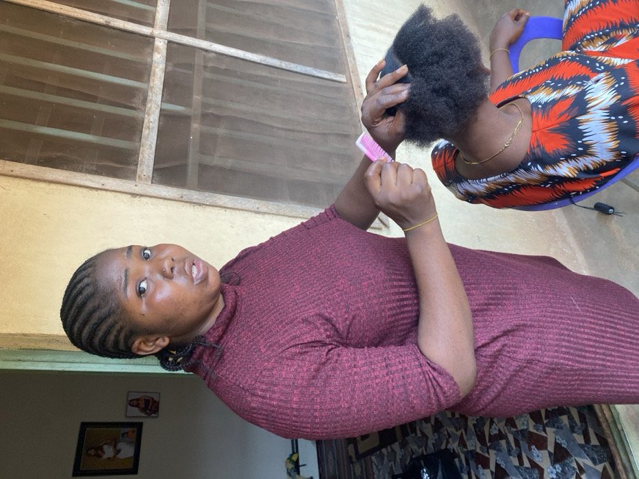 The scene depicts an interior or semi-open domestic space in Akwanga, Nigeria. Two females are present. A standing female, positioned centrally, wears a dark red, ribbed, three-quarter sleeve turtleneck dress and has her hair styled in cornrow braids. She possesses a nose piercing and a thin yellow bracelet on her right wrist. Her mouth is slightly open, suggesting speech or a paused action, and she looks towards the viewer. Her hands are engaged with the hair of a second female, who is seated. The seated female is viewed from behind and the right side, wearing a multi-colored patterned dress with a square neckline, primarily orange, black, white, and brown. She also has a thin yellow bracelet on her right wrist and a thin gold-colored necklace. Her natural afro-textured hair is being combed by the standing female using a pink comb. She is seated in a blue plastic chair. In the background, a light-colored wall with two framed pictures is visible to the left. A patterned rug or mat is partially visible on the floor beneath the seated individual. To the right, a wooden-framed window or door with a screen is present, indicating natural light. A black cable is visible near the seated individual's left side.