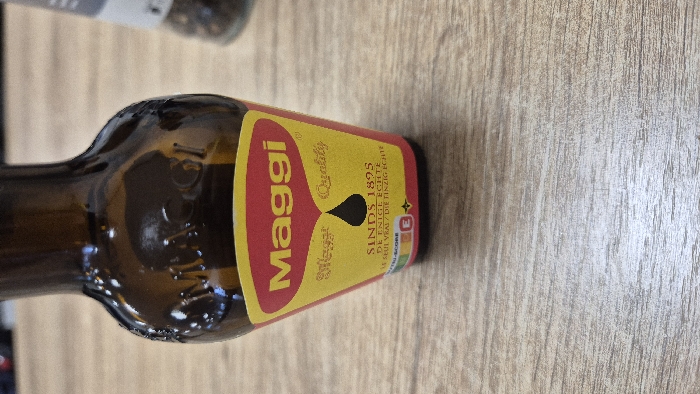 - "The scene, located in Maasvlakte Rotterdam, Netherlands, depicts an amber-colored glass bottle of Maggi liquid seasoning standing upright on a light-toned, wood-grain surface" by FM-g9VM03, licensed under CC BY 4.0
