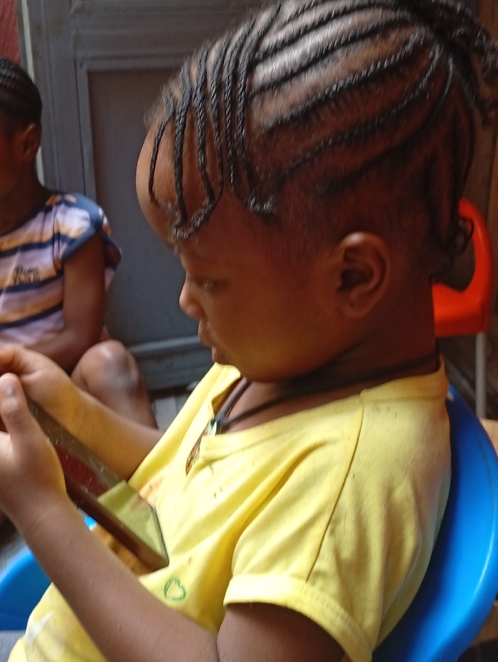 In Sabon Gari East, Nigeria, a young person with dark skin and a braided hairstyle, styled in cornrows from the crown towards the nape and sides, is seated on a blue plastic chair