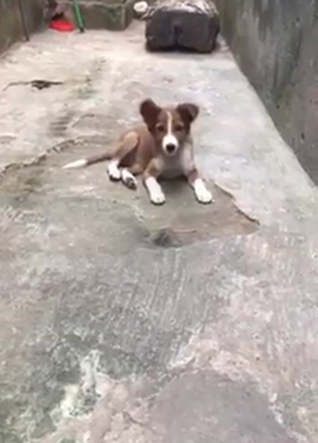small brown and white puppy lying on a cracked, gray concrete surface. The puppy is facing the camera with its paws outstretched and its ears perked up. A voice calls out, "Doggy," and the puppy immediately jumps up and runs toward the camera. The background consists of concrete walls and a few scattered objects, including a green broom, a small red object, and a large rock. The environment looks like a confined outdoor space or a small courtyard.