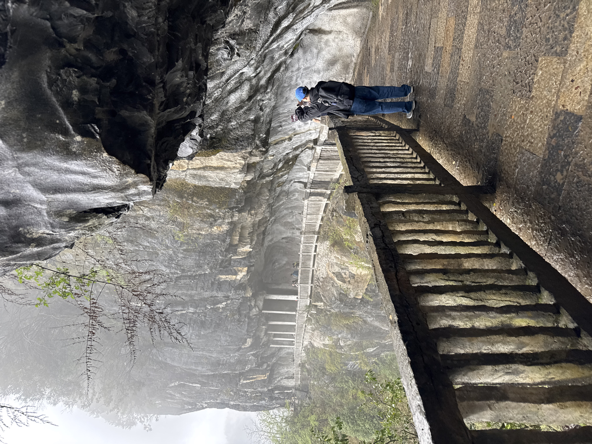 A person stands on a stone pathway, taking a photo of a deep, misty gorge with a series of concrete bridges and staircases built into the vertical rock face