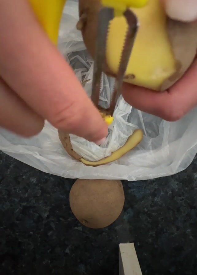 someone peeling a potato. The person holds a partially peeled potato in their left hand and a yellow peeler in their right hand. They peel off a strip of the potato peel, which falls into a plastic bag. There are two potatoes and pieces of peels inside the plastic bag, which is resting on a speckled dark-colored counter.