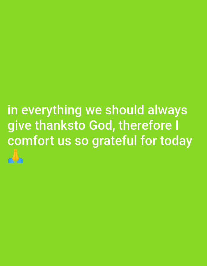 The image displays white text on a solid, bright green background. The text reads: "in everything we should always give thanksto God, therefore I comfort us so grateful for today". Below the text, on the left side, is a 🙏 (folded hands) emoji. No physical location, individuals, objects, or environmental details from Narayi, Nigeria, are depicted in this digitally generated image.