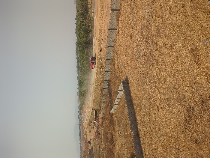 This image captures an expansive, arid landscape in Karsana 2, Nigeria, under a hazy, light-gray sky. The foreground is dominated by dry, light-brown vegetation covering flat terrain. A partially constructed, L-shaped wall made of gray concrete blocks, approximately two to three courses high, defines a plot within this area. In the midground, a wide, unpaved dirt road or construction path extends from left to right. A red dump truck is visible on this road, moving towards the left and generating a significant cloud of dust behind it. Further to the left on the disturbed earth adjacent to the road, another dark-colored heavy construction vehicle is discernible. A line of green trees borders the right side of the dirt road. In the distant background, faint, undulating hills or mountains are visible through the atmospheric haze. No individuals are present. The scene indicates ongoing land development or road construction activities in a dry environmental setting.