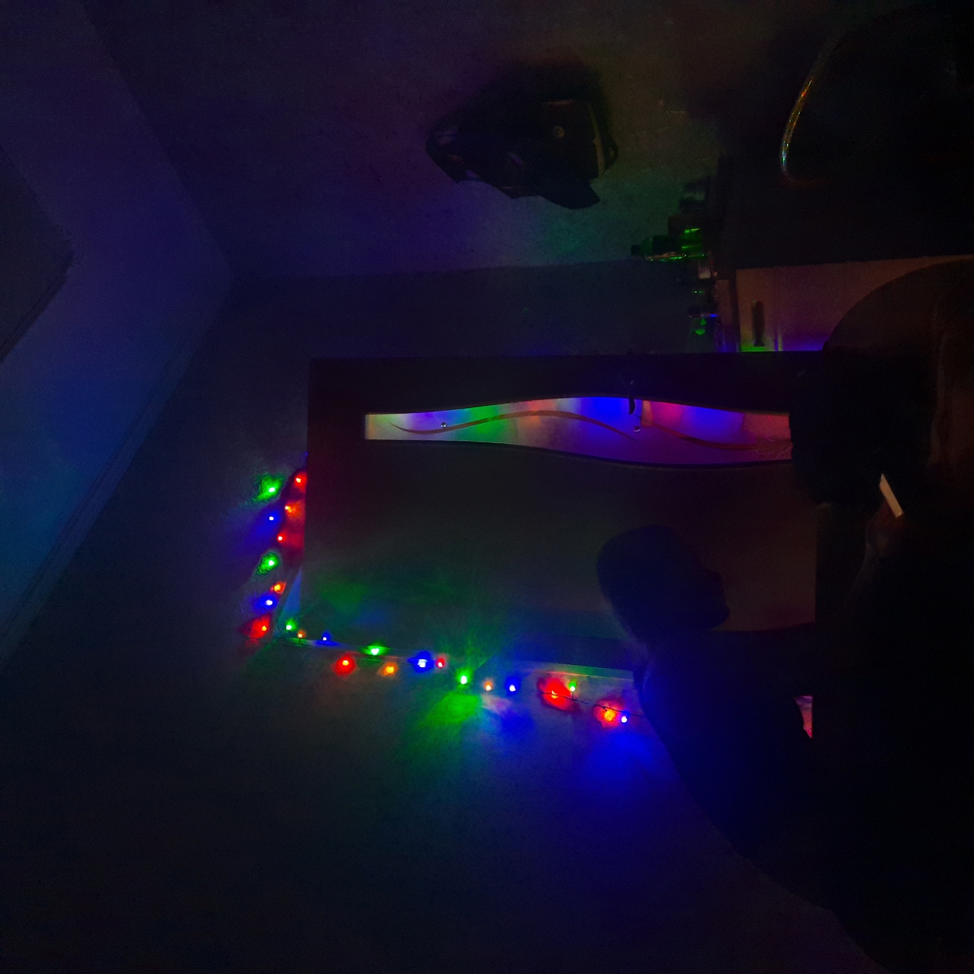 The scene depicts a dimly lit indoor room in Kurganinsk, Russia. A single individual, silhouetted from the torso up, is positioned in the foreground, left of center, seated or leaning over a dark, round table. Their head is bowed, and they are actively interacting with a rectangular electronic device, likely a smartphone, which emits a bright, white-yellow light illuminating their hands and a small portion of the table surface. Multicolored string lights, featuring red, green, and blue bulbs, are strung along the left wall, curving upwards and then horizontally across the top section before descending along the side of a dark door or doorframe located centrally. The door exhibits a vertical, reflective design element that refracts the colored lights. To the right of the door, on a dark surface, multiple bottles and indistinct objects are discernible. A dark backpack hangs on the wall in the upper right quadrant of the image. A segment of a chair, showing a reflective edge, is visible in the lower right foreground. The overall environment is dark, with the primary illumination provided by the string lights and the electronic device.