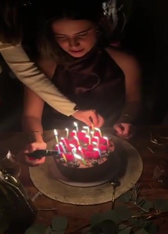 The scene depicts a woman sitting at a wooden table with a birthday cake in front of her. The cake is decorated with numerous lit candles and fresh berries. Someone with a white-sleeved arm is leaning in to light the last candle. The woman looks toward the cake. There's a bottle of wine and some greenery decorating the table. The scene has dim lighting.