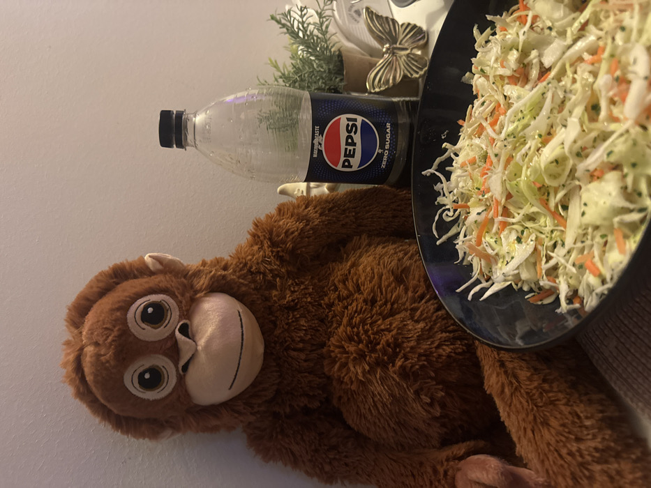 This image captures an indoor scene located in Varna, Bulgaria. A large, brown plush monkey toy is seated on the left side of the frame, facing slightly right, against a plain, light-colored wall. To the right of the monkey, a clear plastic bottle of Pepsi Zero Sugar, partially consumed with condensation visible, stands upright. The bottle has a black cap. Behind the Pepsi bottle, a small potted plant with green foliage is positioned. Further to the right, a gold-colored decorative object resembling a butterfly is visible. In the immediate foreground, a dark blue or black bowl contains a salad composed primarily of shredded white cabbage and orange carrots, coated in a light dressing with visible green specks. The overall scene suggests a prepared meal or snack.