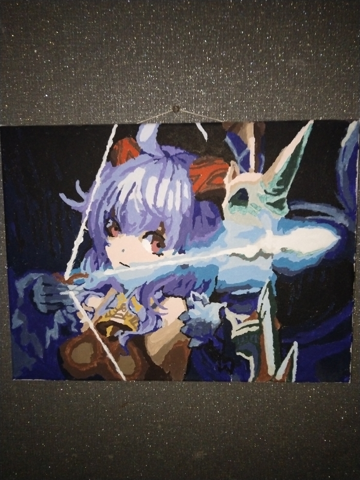 A vibrant, stylized painting features a character with lavender hair, red horns, and red eyes drawing a bow. The bow is depicted with icy blue hues. The character wears a golden bell necklace. The background is a dark, deep blue, creating a contrast with the brighter colors of the character and the bow. The piece appears to be a fan art of a character from a video game.