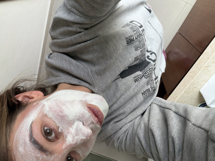 A person with a white face mask looks at the camera, wearing a grey hoodie