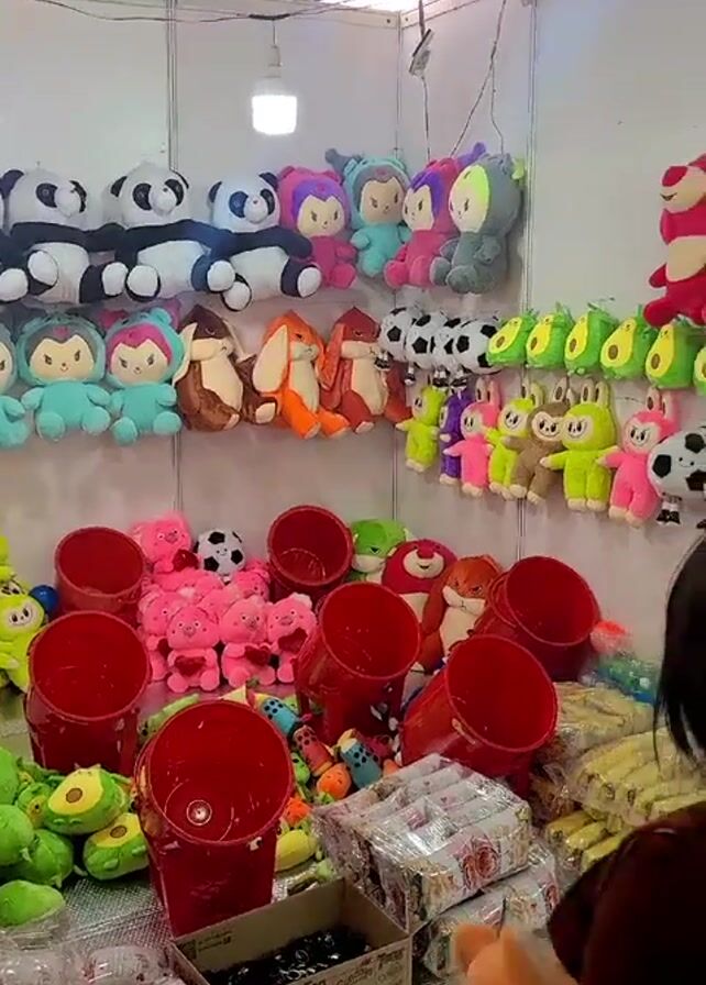 merchandise booth filled with plush toys of various shapes and colors. The plush toys include pandas, rabbits, avocados, and soccer balls, and they are displayed on the shelves behind the counter. There are red buckets on the counter in front of the plush toys, which are possibly used for customers to choose toys for purchase. Underneath the counter is a selection of packaged snacks, including Oishi brand products. A person with short, dark hair is standing near the right side of the frame and seems to be looking at the merchandise. The environment appears to be a crowded market or fair setting.